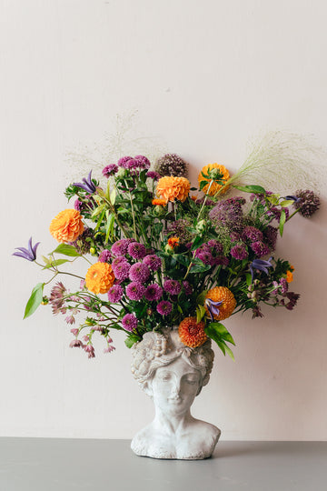 Original cerámica con forma de cabeza de mujer con arreglo floral variado en tonos vivos. Es un detalle ideal para ocasiones especiales, como el Día de la Madre.