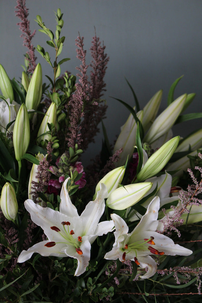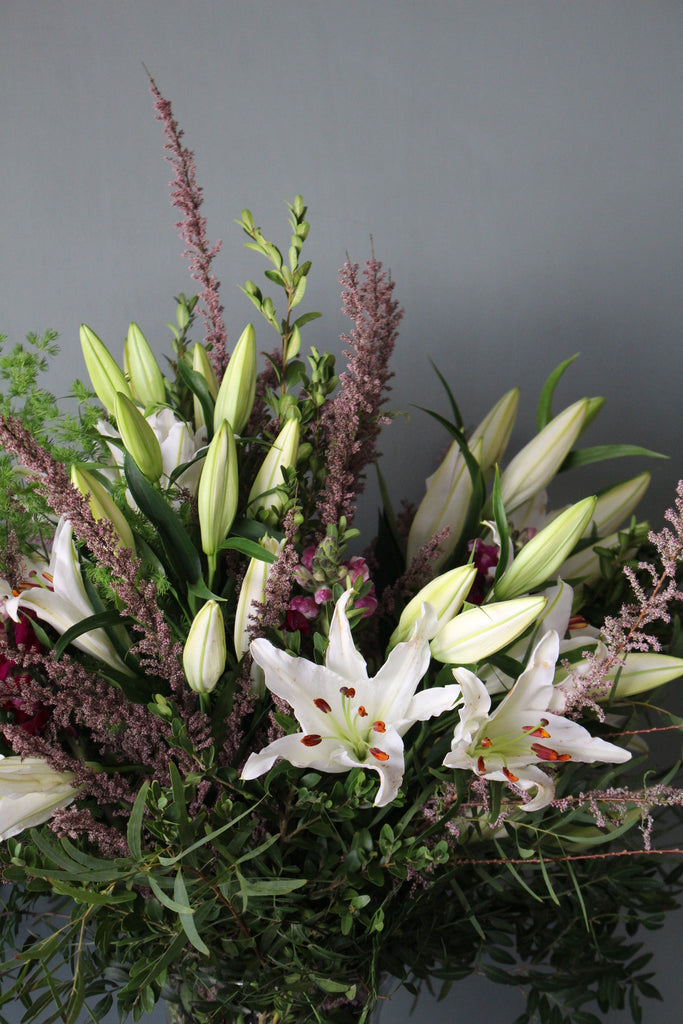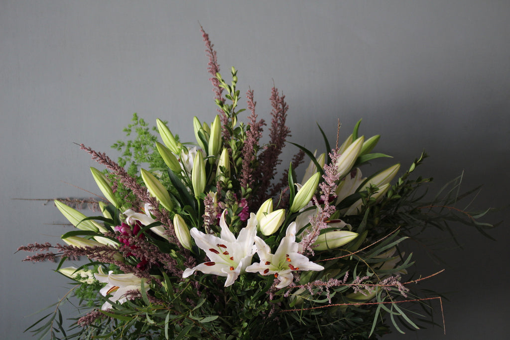 Jarrón de cristal acampanado con arreglo floral de liliums blancos.