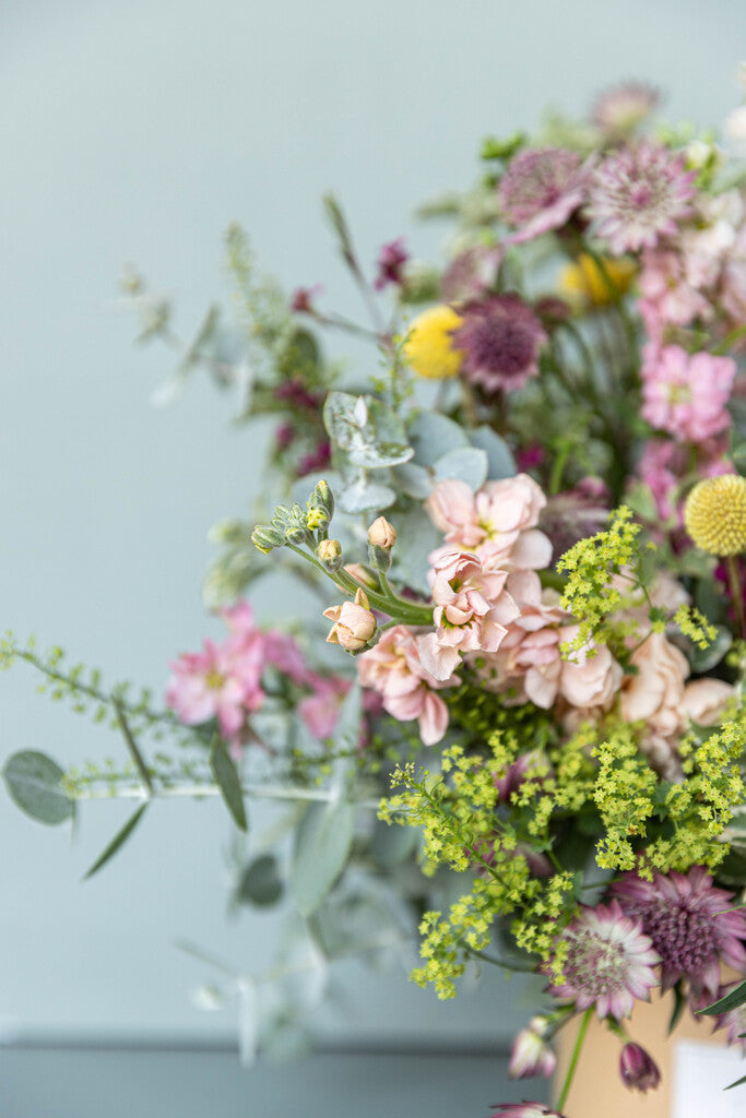 Caja kraft con arreglo de flores silvestres en tonos pastel.