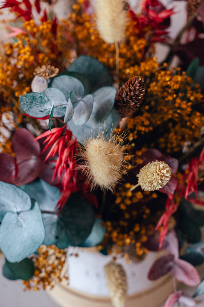 Caja kraft mini con flor seca y preservada en rojos y tejas