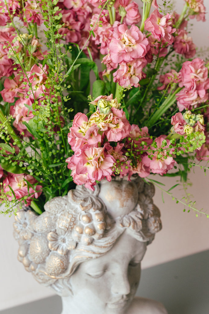 Original cerámica con forma de cabeza de mujer con arreglo floral compuesto por alhelíes rosas. Según disponibilidad, también se podría hacer con alhelí blanco, lila, fucsia... Si te apetece otro color, indícanoslo en comentarios a la hora de hacer el pedido, o por teléfono, y te confirmaremos si es posible.