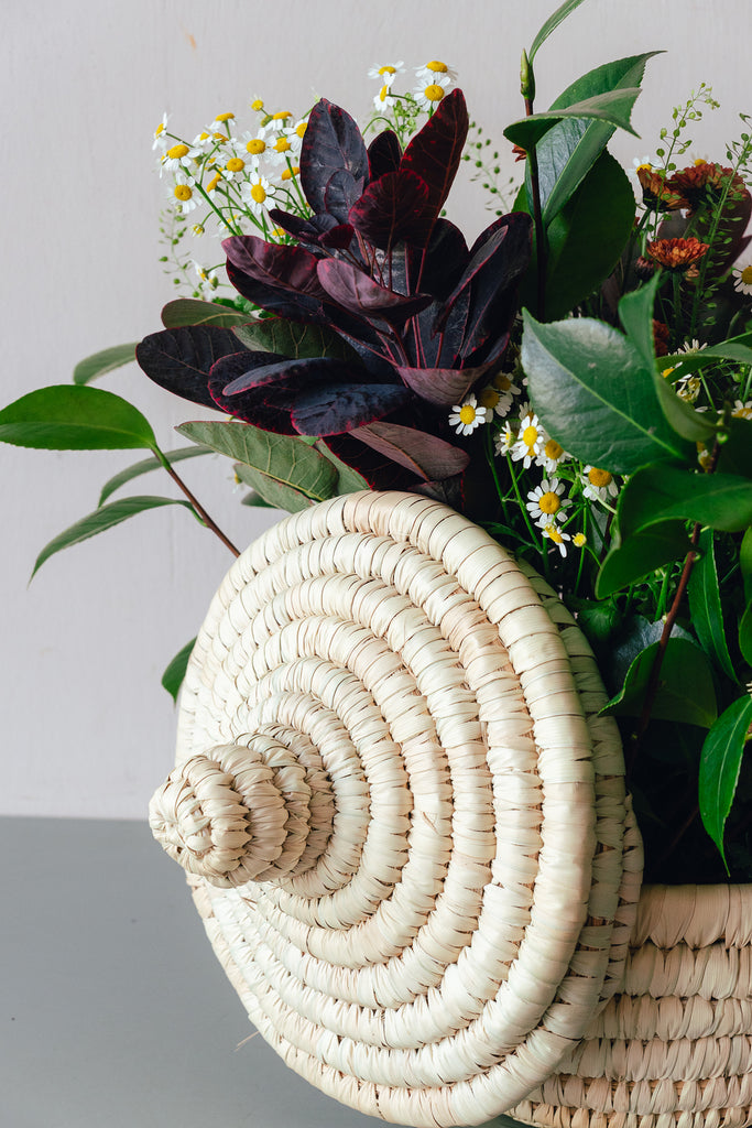 Tajine de palmito con tapa, con arreglo floral silvestre en tonos granate.