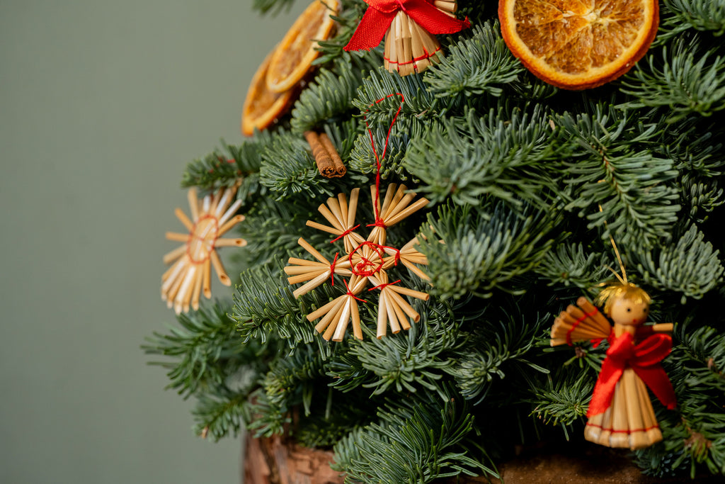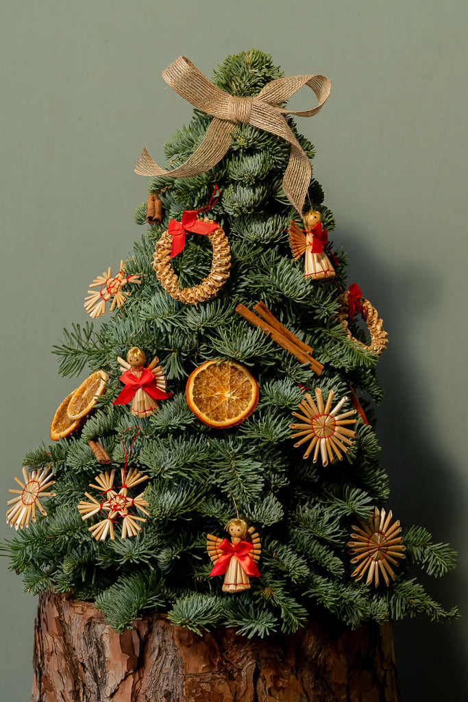 Arbolito natural decorado con adornos navideños y naranja deshidratada.