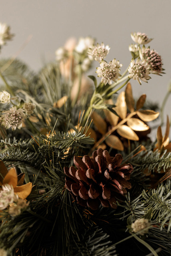 Centro de mesa navideño en tonalidades naturales, con astrantia blanca, lentisco dorado, piñas, lagurus natural, nobilis azul y pinus.