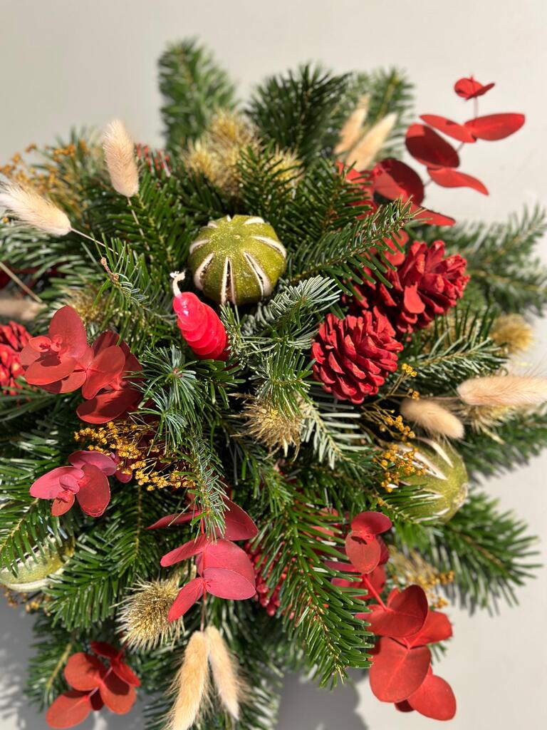 Centro de mesa navideño de abeto y pino con eucalipto y piñas rojos, y limas deshidratadas.
