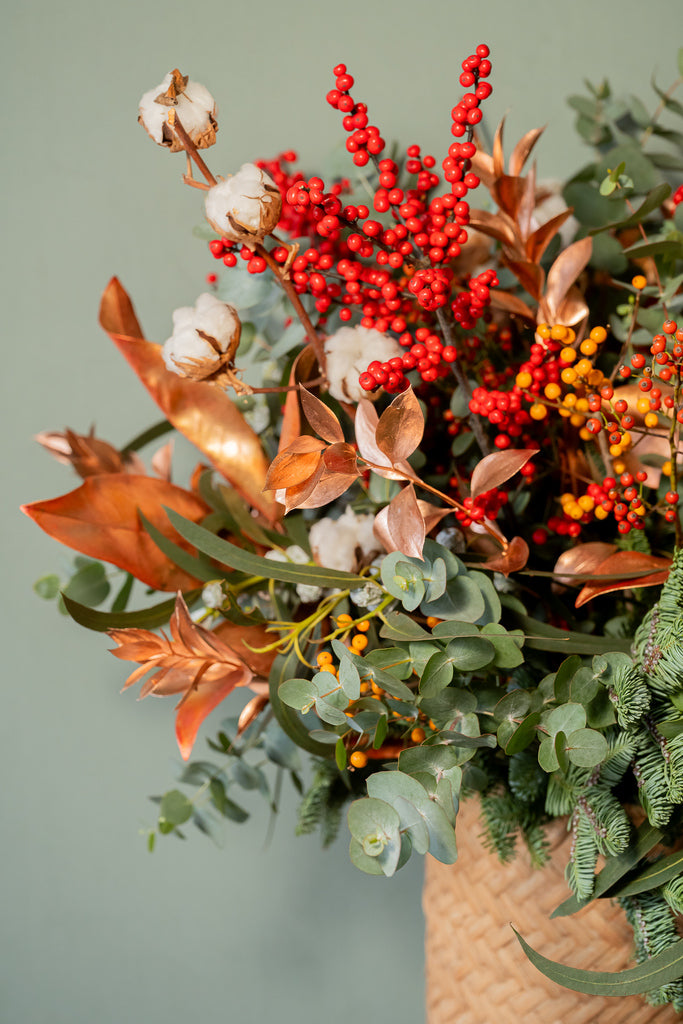 Cerámica navideña imitación cesta con ilex, algodón, magnolio y eucalipto.