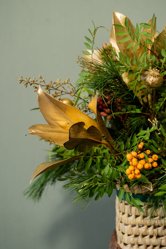 Cesta pícnic pequeña con arreglo de Navidad en tonos tierra, dorado, naranja y verde.