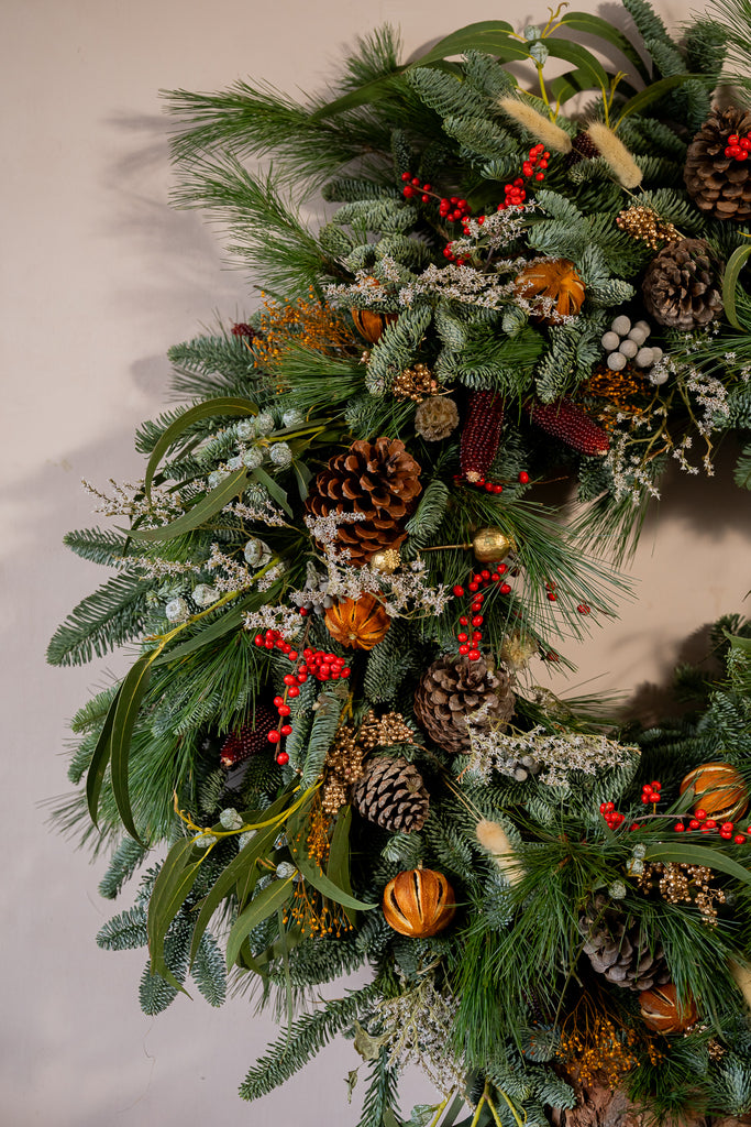 Corona navideña XXL de 90cm de diámetro. Base de abeto con eucalipto, verdes ,piñas e ilex