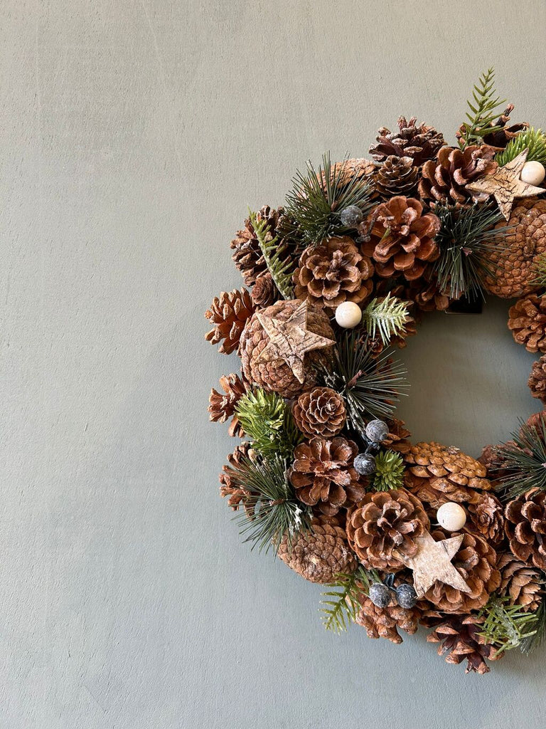 Corona artificial con decoración navideña. Mide unos 30cm de diámetro.