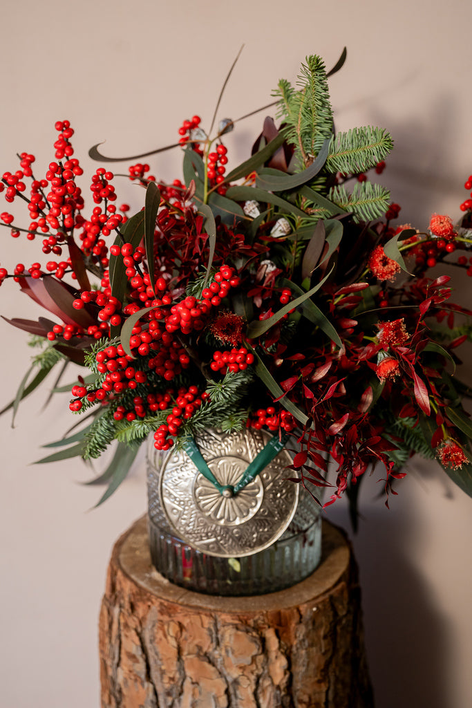 Elegante galletero de cristal con arreglo navideño en tonos rojo, granate y verde.