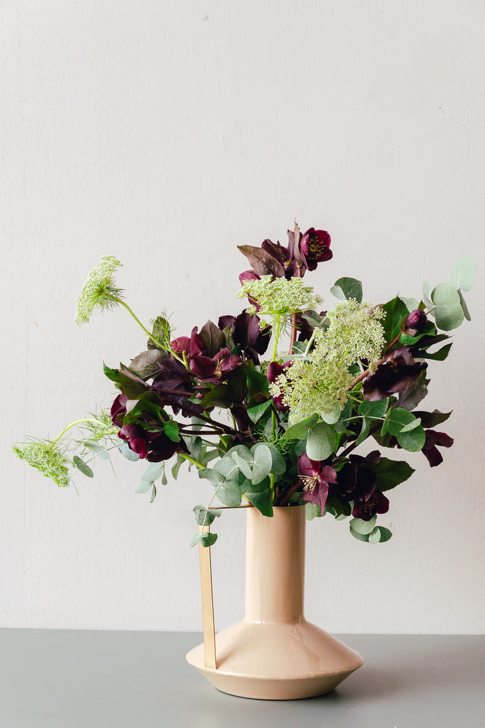 Jarra esmaltada nude con arreglo floral en tonos granates y verdes.
