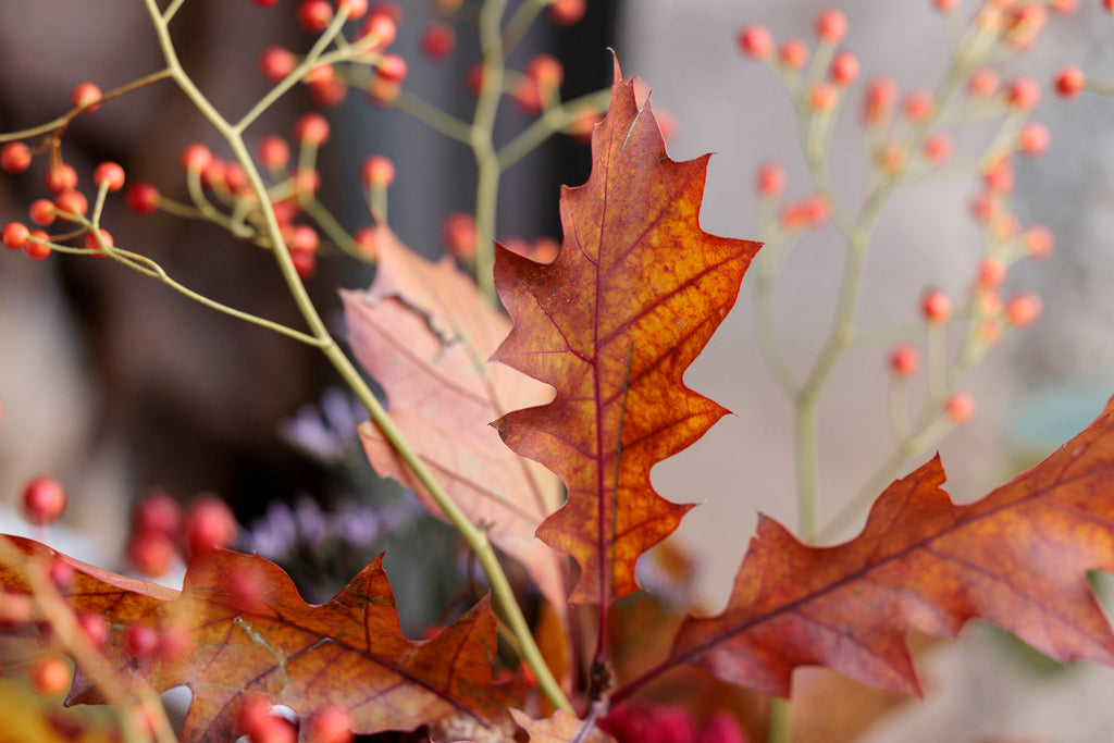 Ramo otoñal con bayas, roble y flores en tonos naranjas y granates
