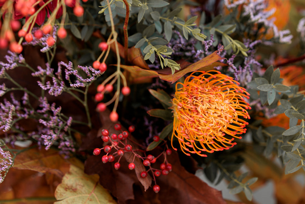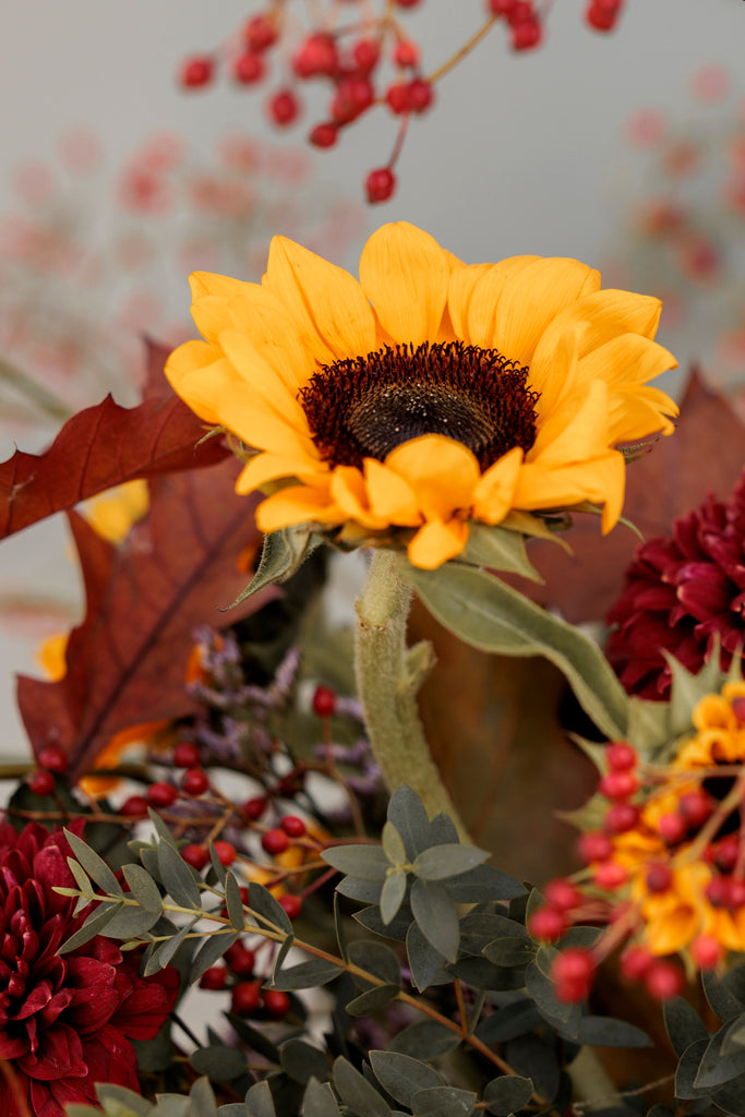 Ramo grande otoñal con bayas, roble y flores variadas en tonalidades naranjas y granates. Perfecto para un regalo especial en los meses de otoño e invierno.
