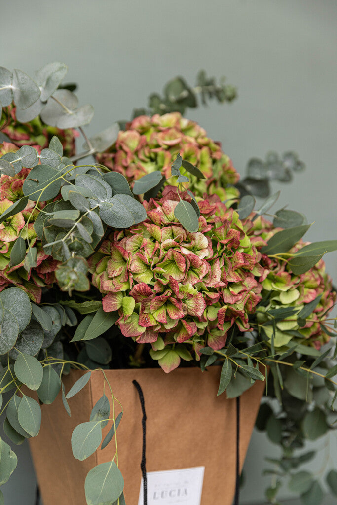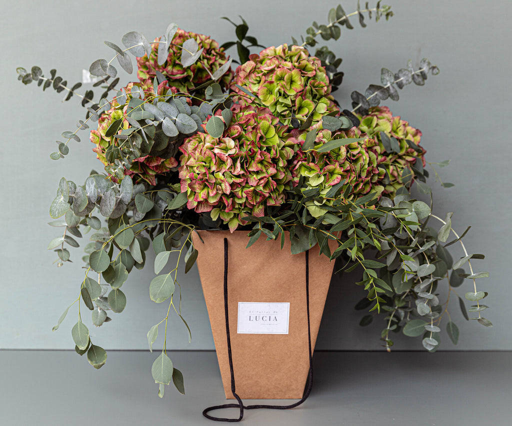Bolsa kraft con asa con hortensias y eucalipto. El tono de las hortensias variará en función de la época y disponibilidad.