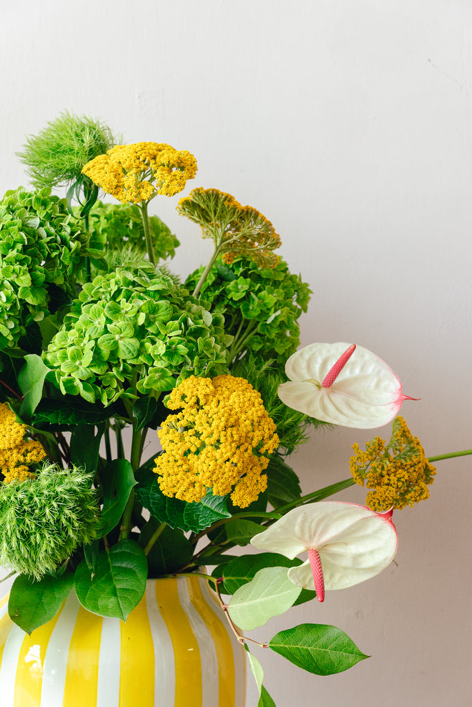 Jarrón de cerámica de rayas amarillas y blancas con flor en tonos verde y amarillo, como hortensia, clavel barbatus y anthurium.