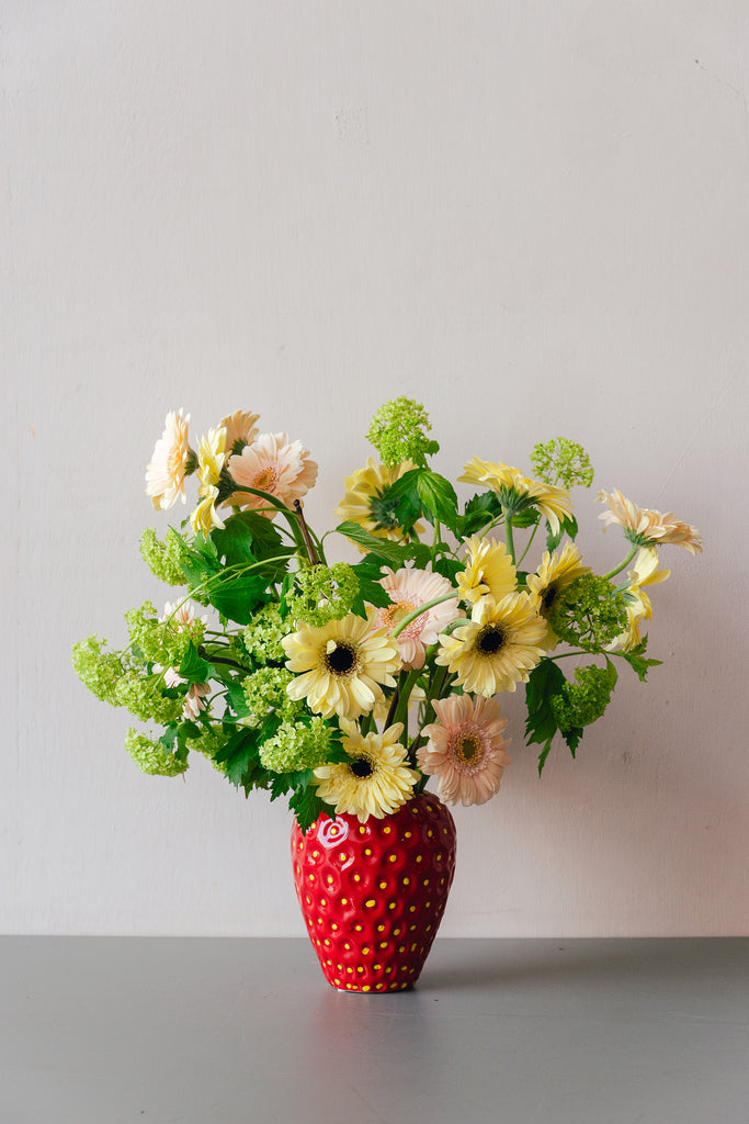 Cerámica en forma de fresa con arreglo de gerberas en tonos amarillos y rosas