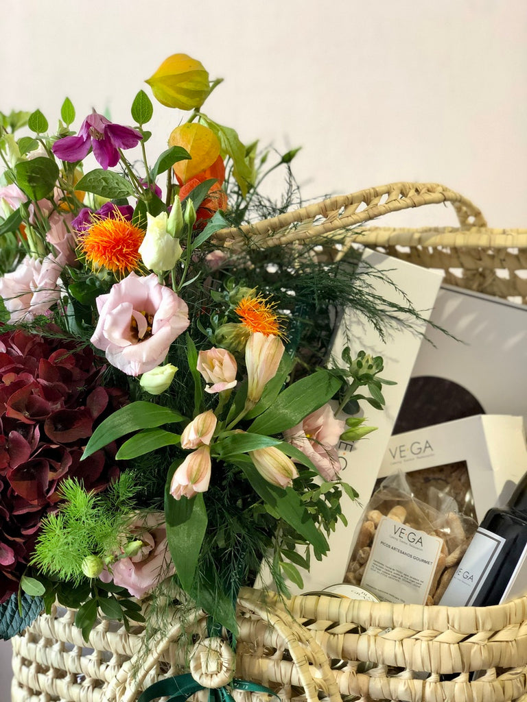 Maleta con caja de flores de temporada y selección de productos de VEGA Catering:
